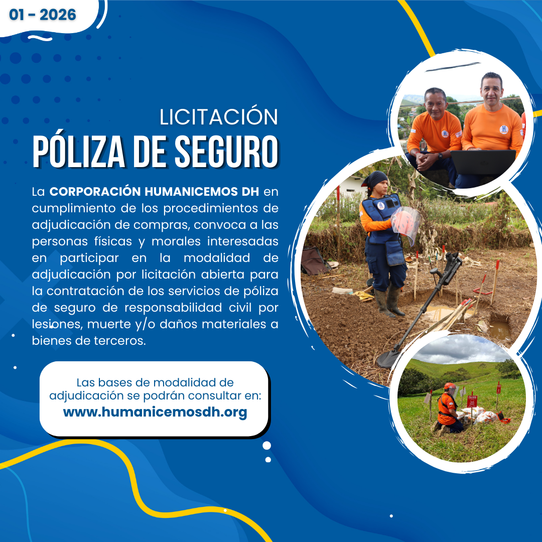 HUMANICEMOS DH es una Organización para la Acción Integral Contra Minas Antipersonal (AICMA) creada en el marco del Acuerdo de Paz entre el Gobierno de Colombia y las FARC-EP, que propende por la Vida, la Reconciliación, la Reconstrucción de los Territorios y la sostenibilidad del medio ambiente.